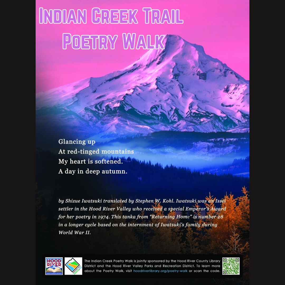 The Indian Creek Poetry Walk blends the natural beauty of Hood River’s Indian Creek Trail with the contemplative inspiration of poetry. Fourteen nature-themed poems are displayed on signs posted at multiple locations along sections of the trail. Local photographers have contributed photos as background images for the poems.