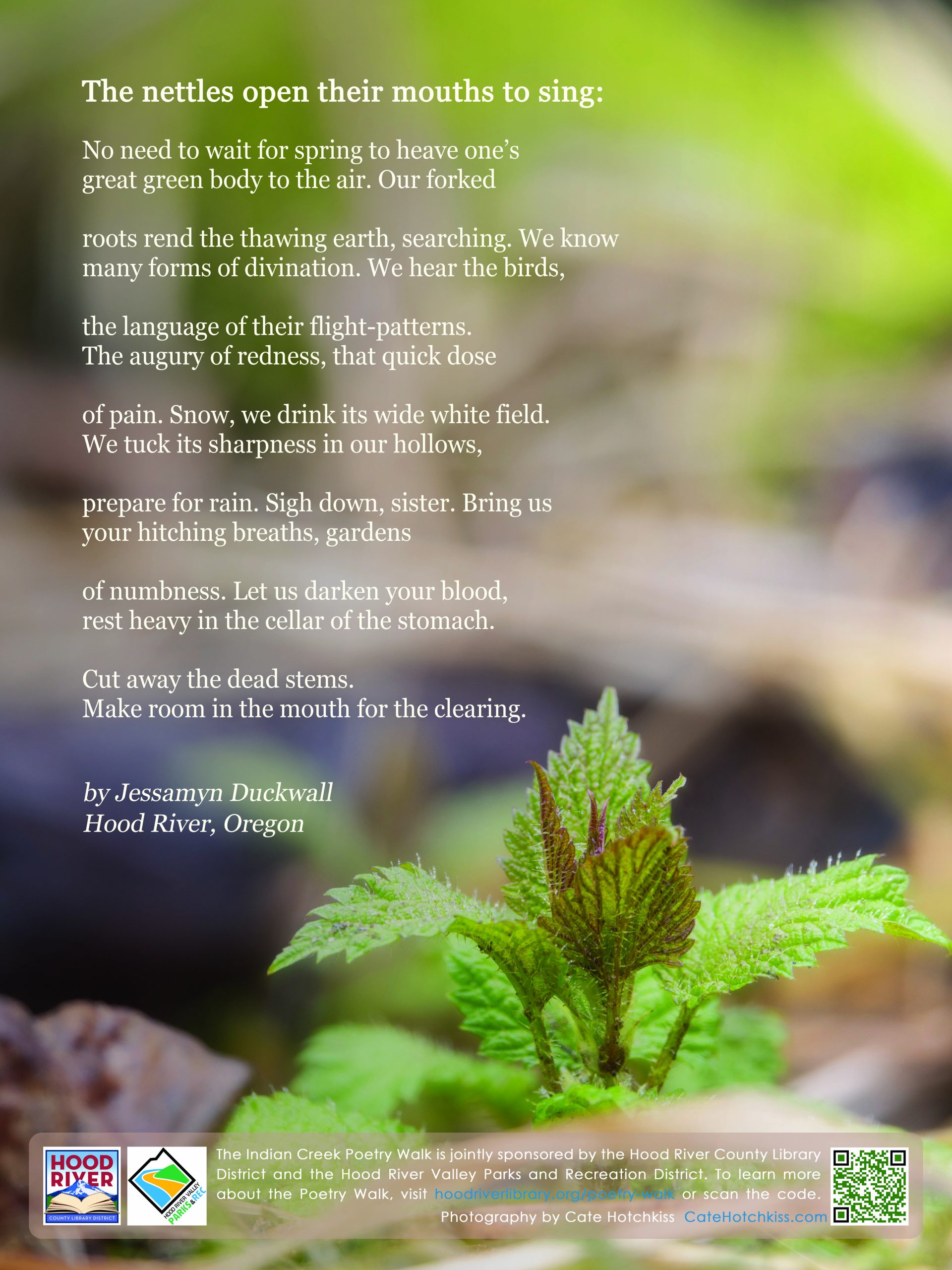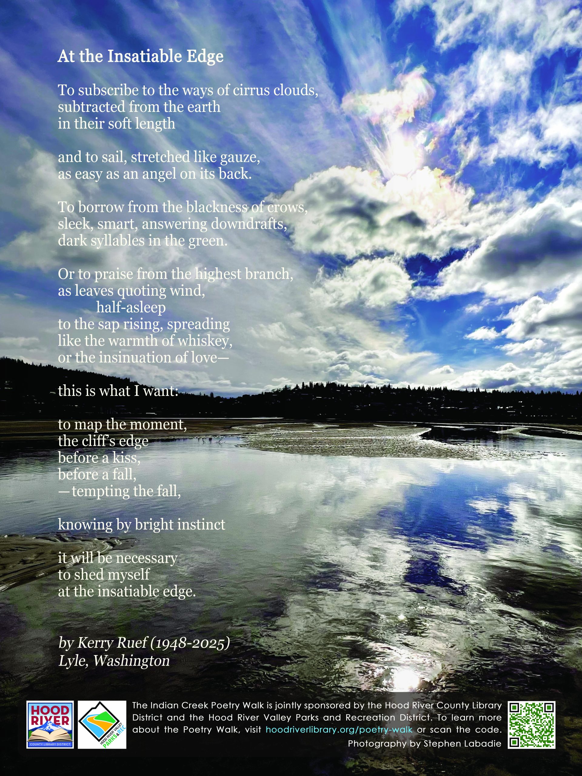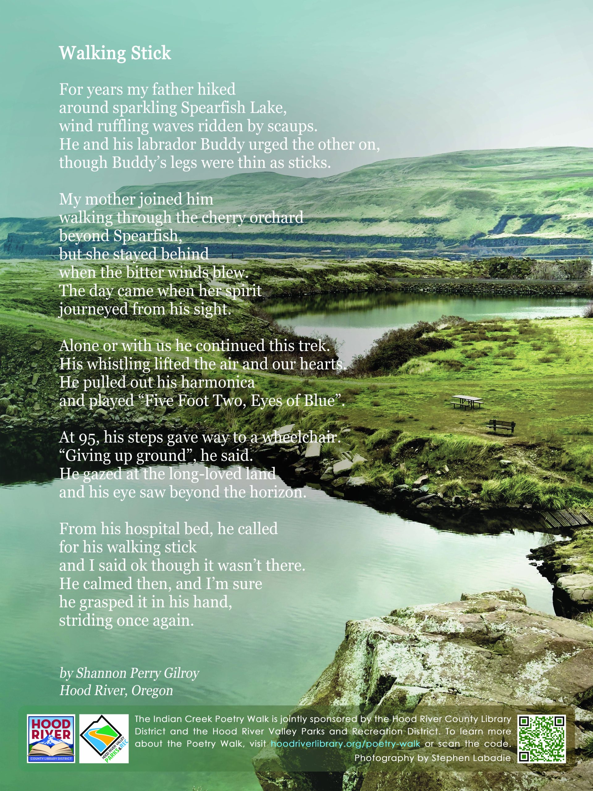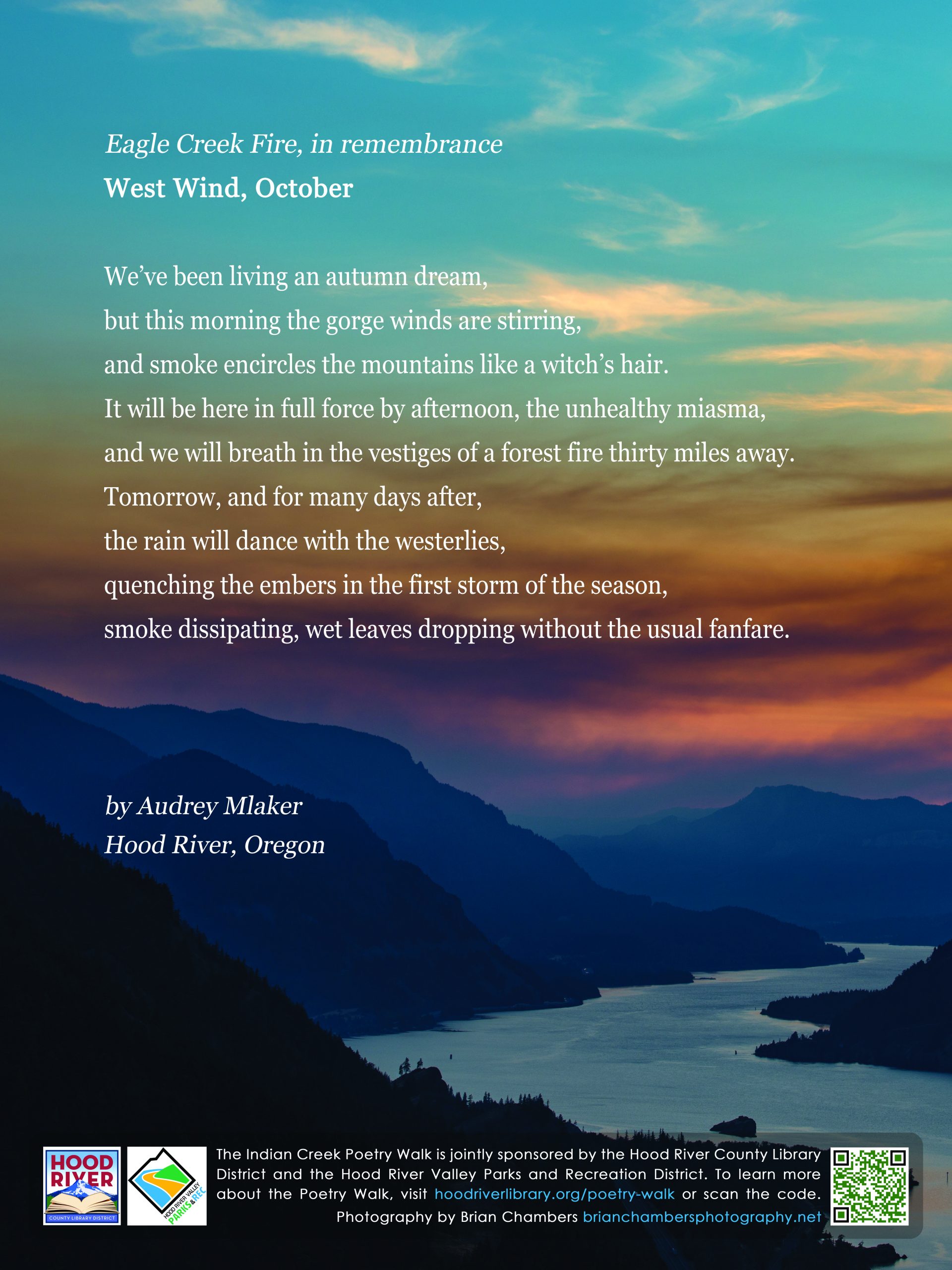 The Indian Creek Trail Poetry Walk is a collaboration of the Hood River County Library District and The Hood River Valley Parks and Recreation District. The goal of the Poetry Walk is to reflect and celebrate the natural and cultural history and beauty of the Mid-Columbia Gorge. To share comments or ask questions, send an email to gorgepoetrywalk@gmail.com. Please support the Poetry Walk with a tax deductible donation.