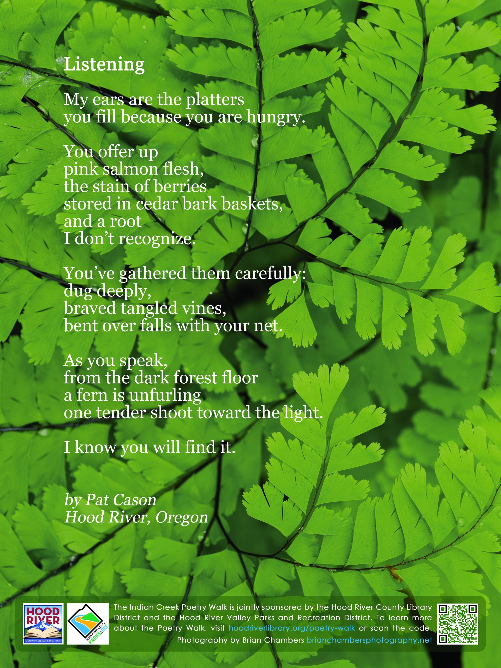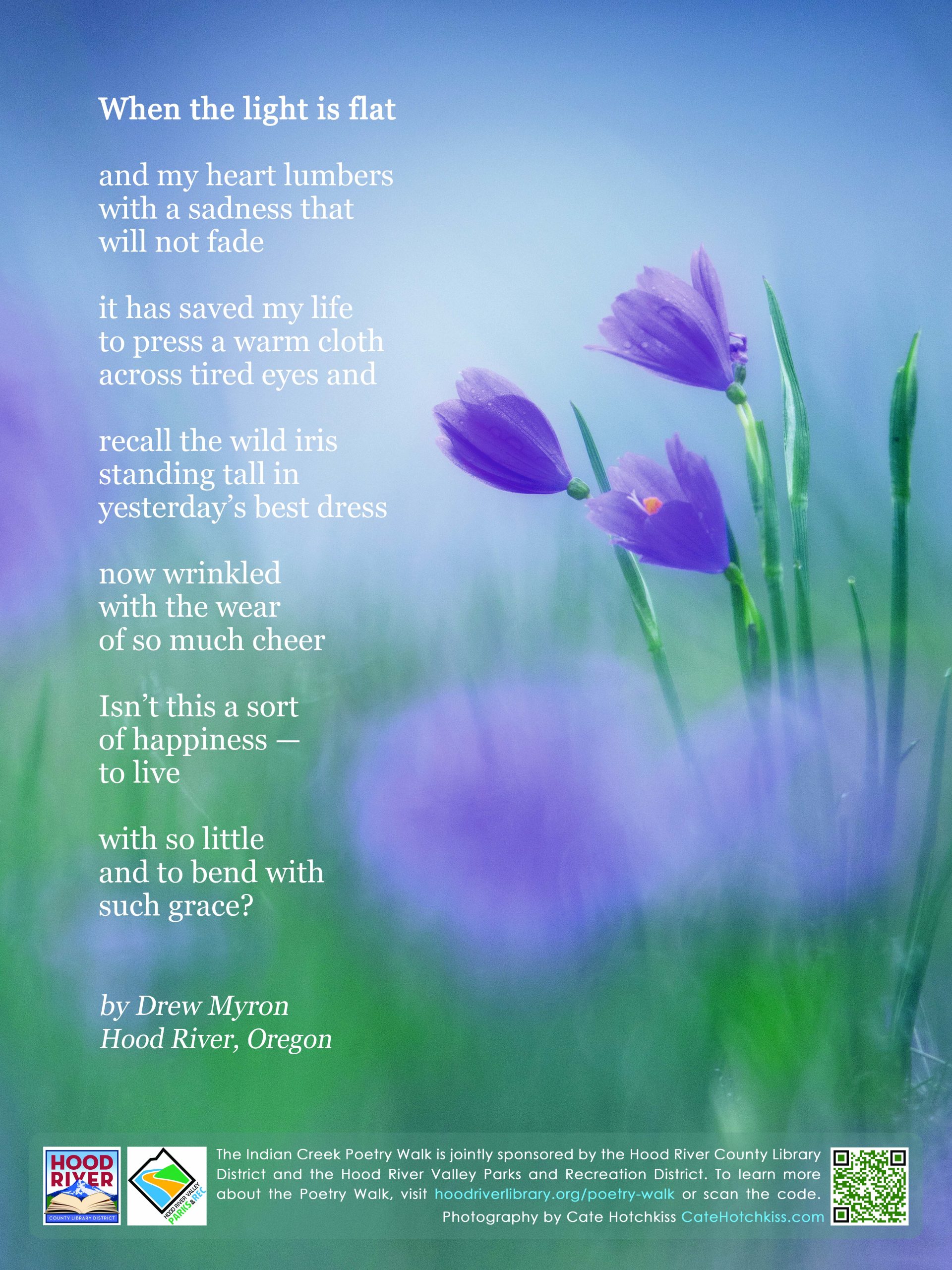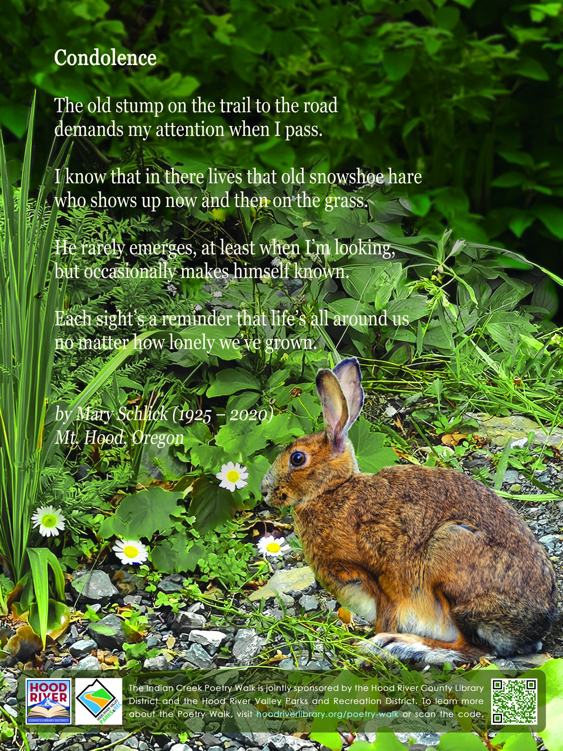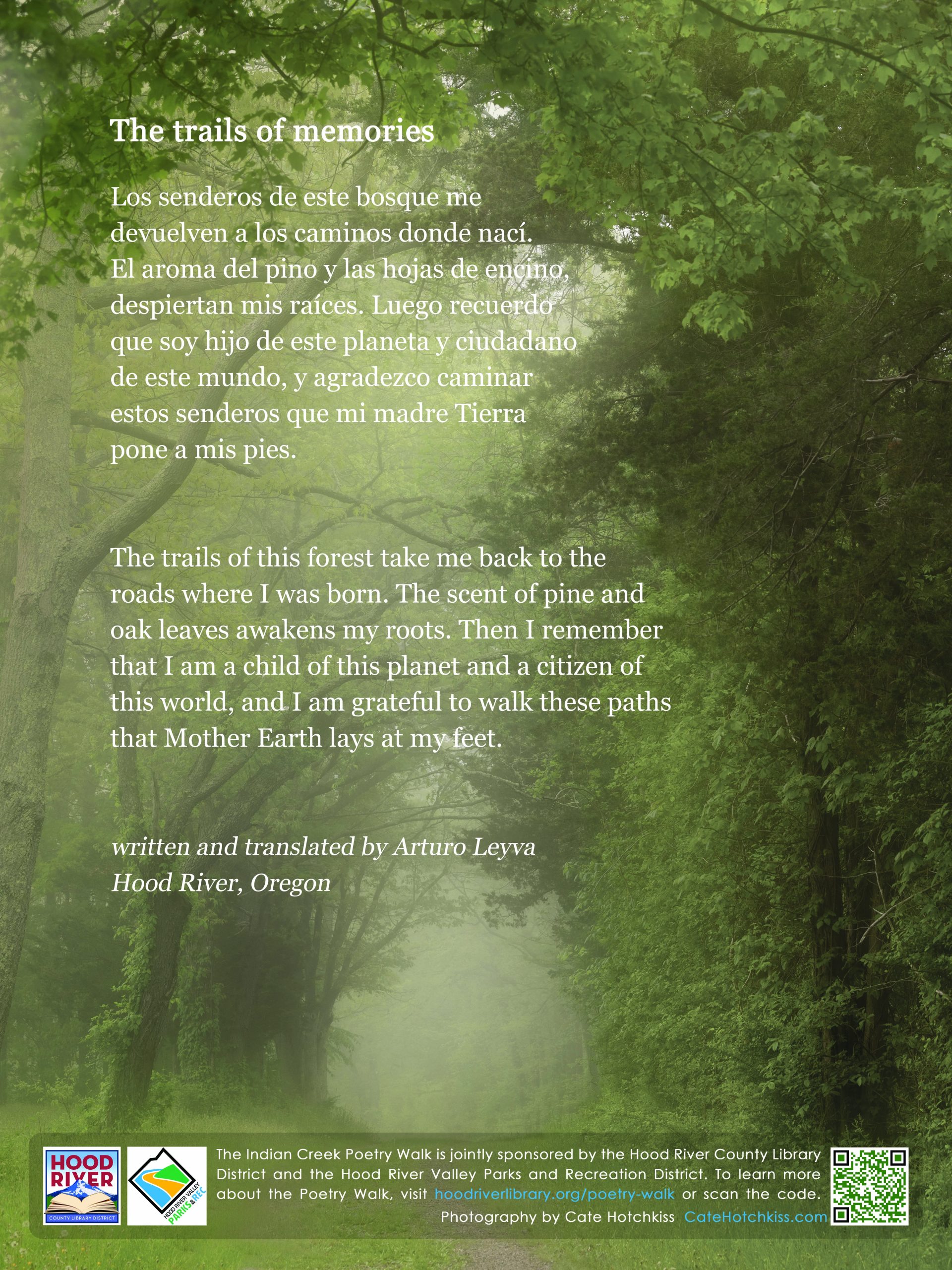 The Indian Creek Trail Poetry Walk is a collaboration of the Hood River County Library District and The Hood River Valley Parks and Recreation District. The goal of the Poetry Walk is to reflect and celebrate the natural and cultural history and beauty of the Mid-Columbia Gorge. To share comments or ask questions, send an email to gorgepoetrywalk@gmail.com. Please support the Poetry Walk with a tax deductible donation.